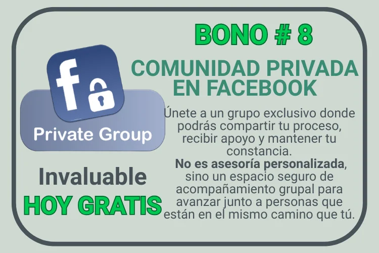 Bono 8: Acceso a la Comunidad Privada de Facebook: Acompañamiento grupal y apoyo constante para avanzar sin sentirte solo(a). (No es asesoría personalizada.)​
